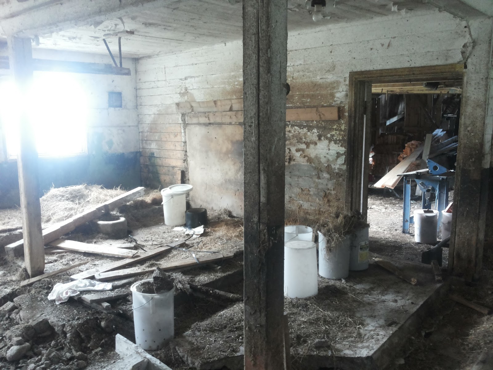 Mikään pieni homma tuo ei ole sillä lattia oli pahasti routinut irti, yksi seinä on laho sekä katosta pieni pala, koska ilmanvaihtohormista on tippunut vettä. Korkeutta pitää tehdä enemmän sekä oviaukkoja suurentaa. Ikkunoidenkin vaihto tulee väistämättä eteen jossain vaiheessa. Muuten aihio on ihan hyvä, erittäin ruma vain. Maali on rapissut ja lohkeillut sekä lehmiltä on jäänyt iänikuiset heinät kaukaloihin. Lisäksi seinät ovat kirjaimellisesti paskan peitossa.